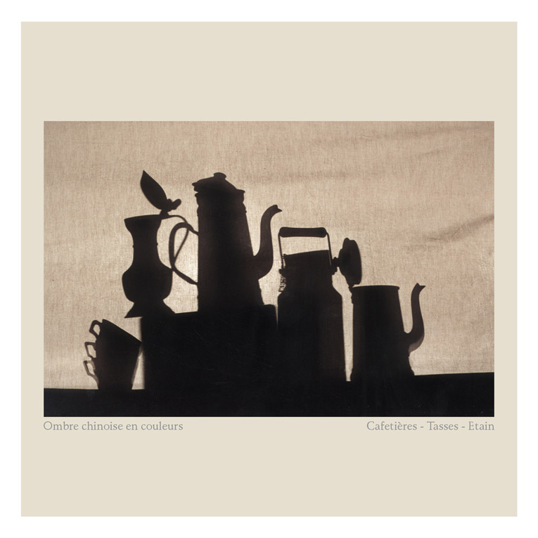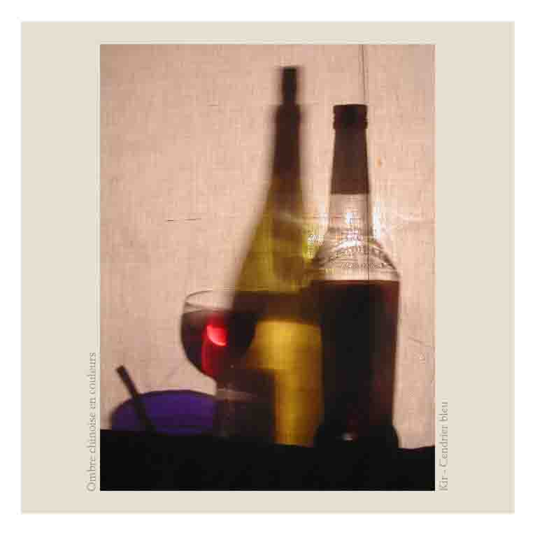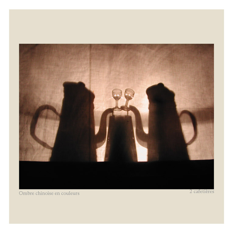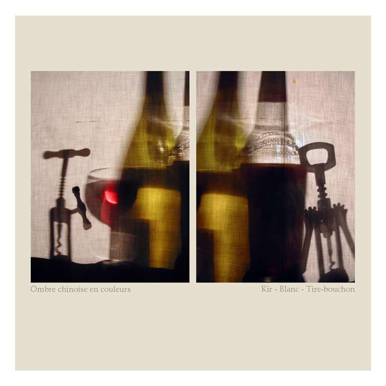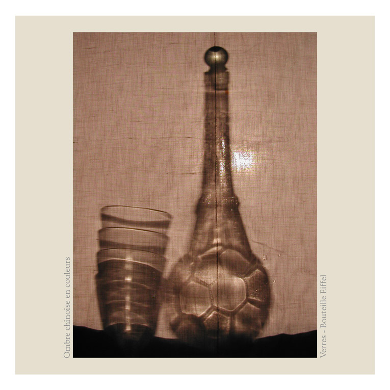 Quand nous pensons Ombres Chinoises, nous visualisons généralement en Noir et en Blanc.... Mais les sujets peuvent être opaques, transparents et donc en couleurs également ! En Noir et Blanc, les silhouettes évoquent ce qui fut en mouvement. Mais avec la couleur, est évoqué la teinte d’un verre rempli de vin, ou bien d’huile, ou encore un parfum...