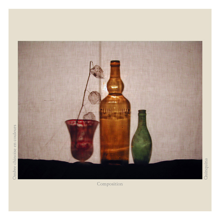 Quand nous pensons Ombres Chinoises, nous visualisons généralement en Noir et en Blanc.... Mais les sujets peuvent être opaques, transparents et donc en couleurs également ! En Noir et Blanc, les silhouettes évoquent ce qui fut en mouvement. Mais avec la couleur, est évoqué la teinte d’un verre rempli de vin, ou bien d’huile, ou encore un parfum...